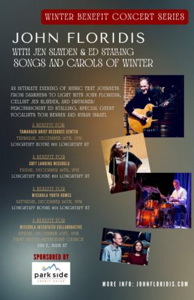 John Floridis, Jen Sladen, and Ed Stalling will be presenting 3 holiday benefit concverts on December 18, 19, and 20th at The Longstaff House. Thursday benefits Tamarac Grief Resource Center, Friday benefits Soft Landing Missoula, and Saturday benefits Missoula Youth Homes. Come out to show your support for live music at LSH and these worthy charities.