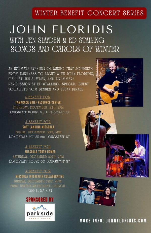 John Floridis, Jen Sladen, and Ed Stalling will be presenting 3 holiday benefit concerts on December 18, 19, and 20th at The Longstaff House. Thursday benefits Tamarac Grief Resource Center, Friday benefits Soft Landing Missoula,[...]